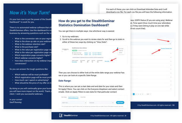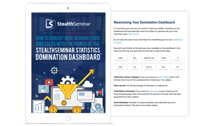 Most webinar digital marketers are flying blind when it comes to statistics. Learn how the StealthSeminar Statistics Domination Dashboard™ will maximize your webinar success for a more rewarding future.