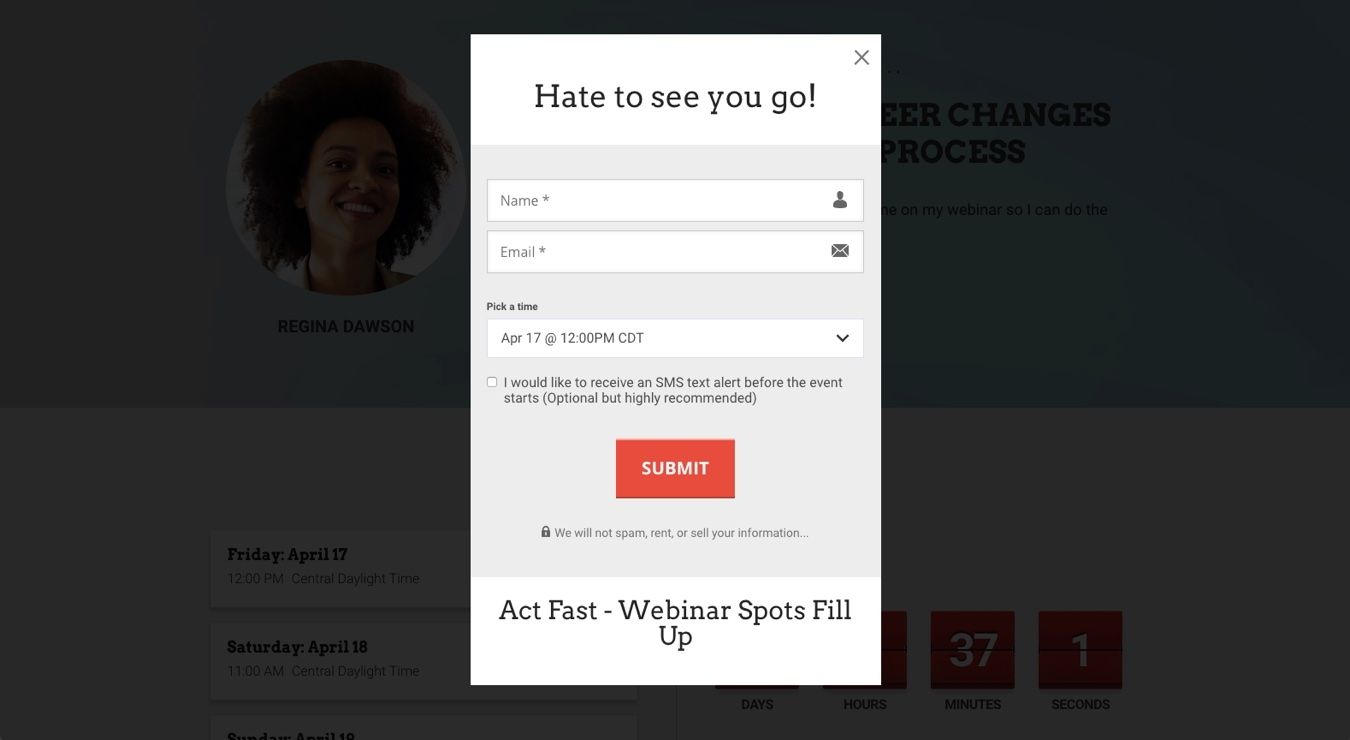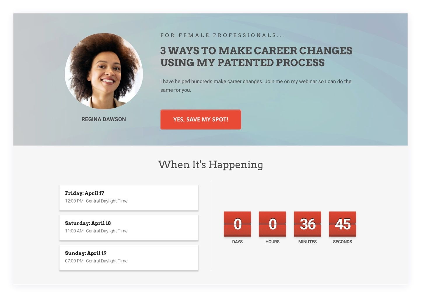 Here is a simple webinar registration page from Regina Dawson. The host uses an eye-catching headline. She also explains exactly what you’re going to learn in her presentation, and invites you to click to get instant access. The host also includes a warning that space is limited. This along with a countdown compels the viewer to sign up quickly so they won’t miss out.